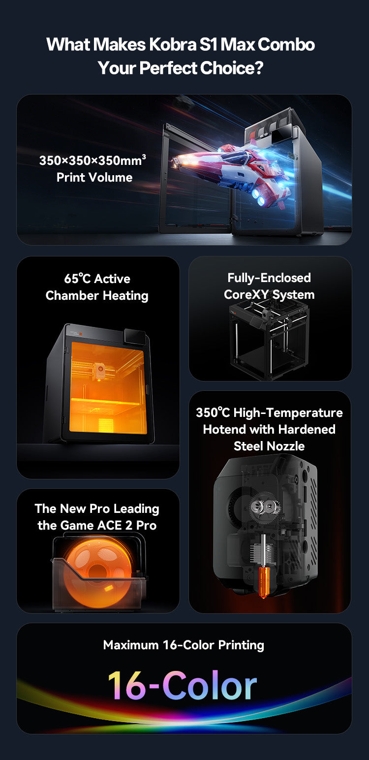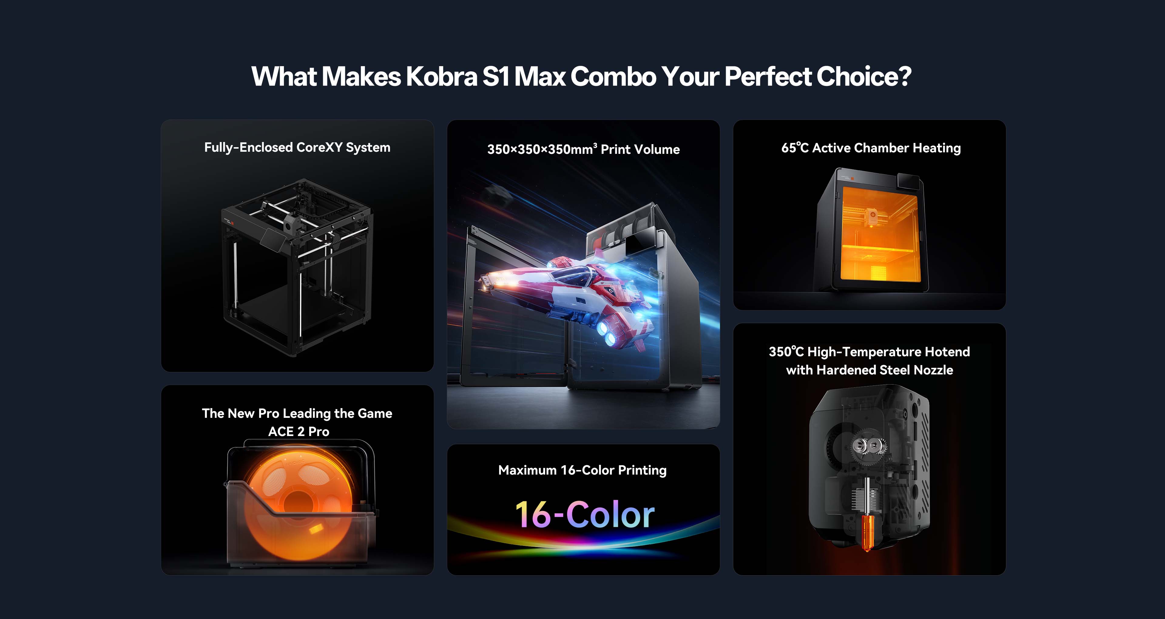 | Machine Weight | Kobra S1 Max: ~25.7KG; ACE 2 Pro: ~3.7KG | ~25.7KG | Kobra S1: 18kg, ACE Pro: 4.6kg |