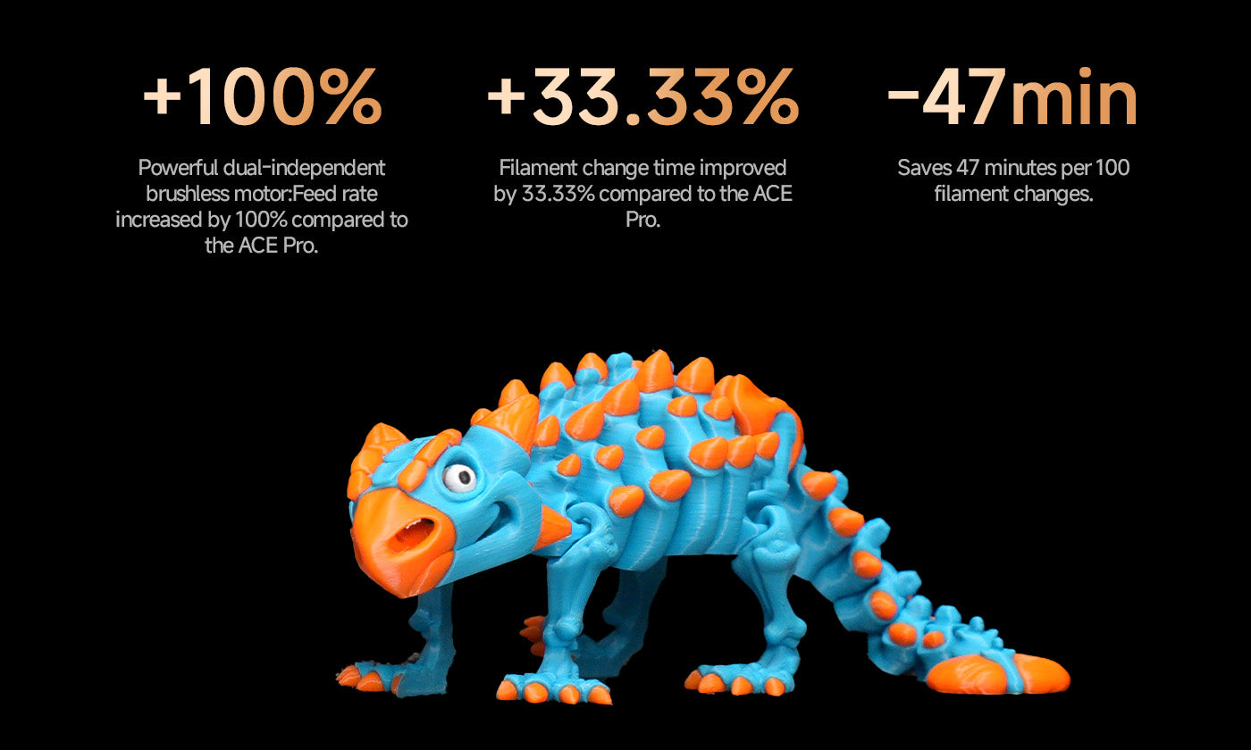 [1] ACE Pro has a feed rate of 25 mm/s, with a filament change time of approximately 84 seconds. ACE 2 Pro has a feed rate of 50 mm/s, with a filament change time of approximately 56 seconds. Note that filament change times may vary with future firmware updates. Data source: Anycubic Lab.