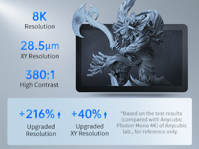 - Designed with a 10-inch monochrome LCD screen with a 7680x4320 resolution and an XY-resolution of 28.5μm, respectively 216% and 40% higher than the Anycubic Photon Mono 4K. The models' sharp corners and delicate edges are perfectly printed, revealing the beauty of sharper details.