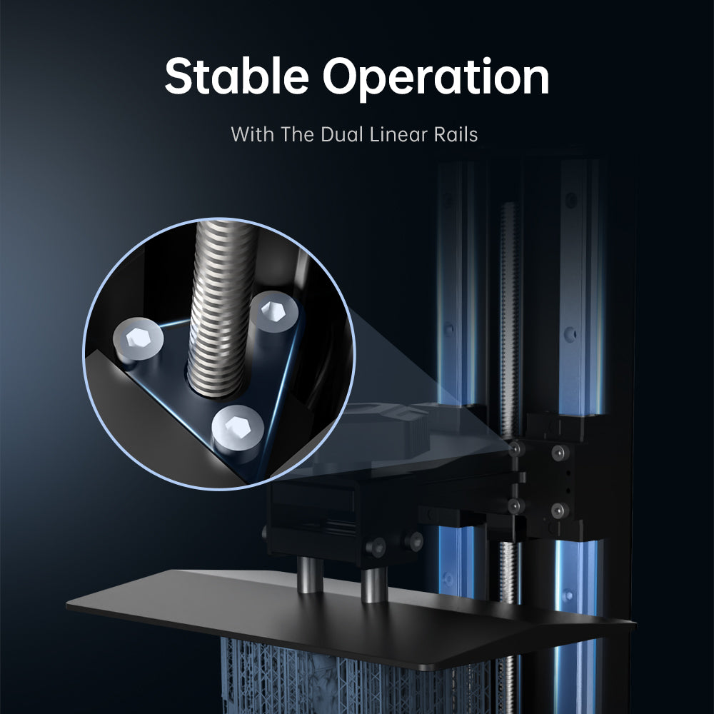 Adopt a high-stability and precision dual linear rails lead screw Z axis, combined with a high-wear-resistant POM clearance nut, to ensure the precise operation of the Z-axis micron-level without shaking, effectively eliminating the layer grain and displaying the beauty of details.