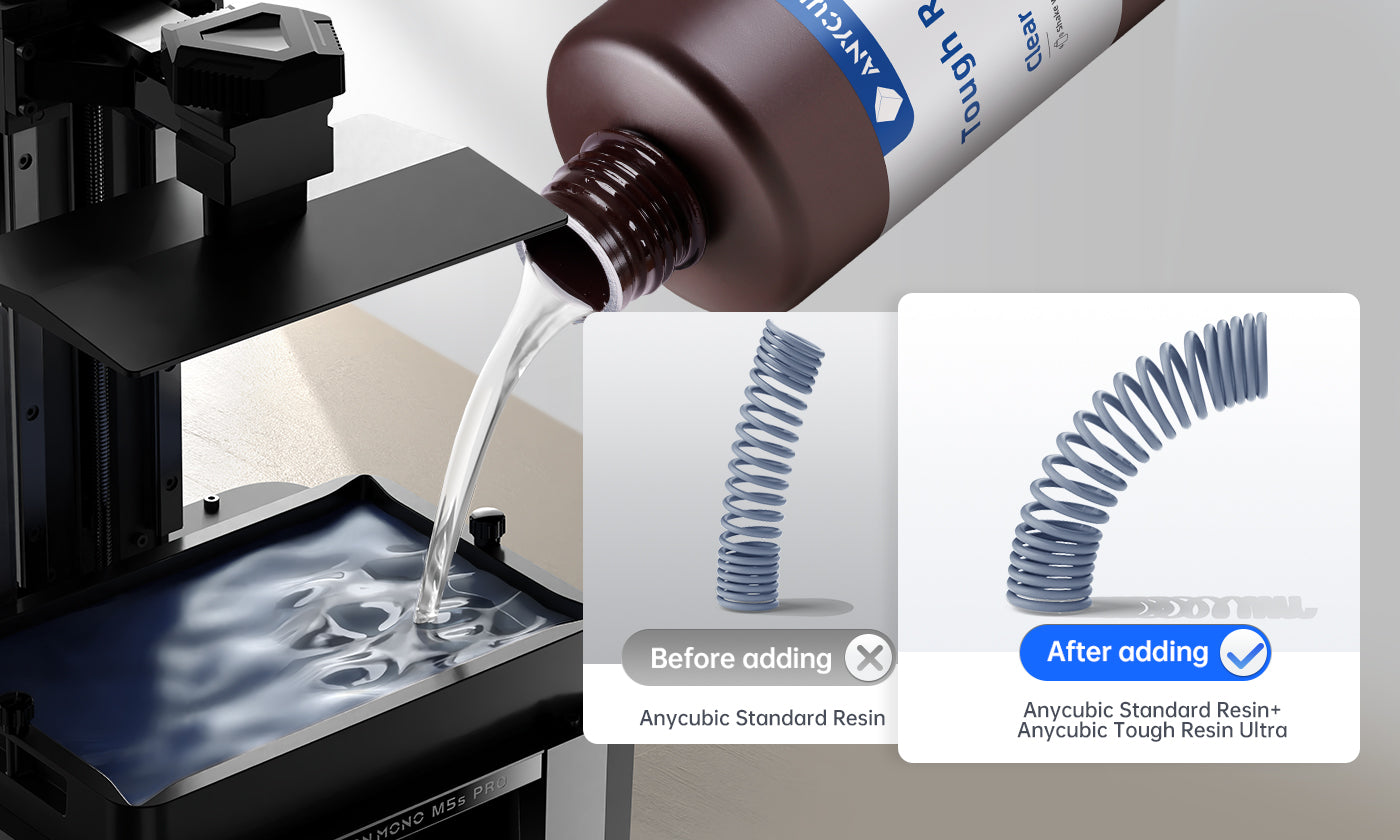Anycubic Tough Resin Ultra serves two purposes: It functions effectively as a standalone printing material, or as an additive to blend with other resins. When mixed, it enhances impact resistance and long-term durability of the final print.