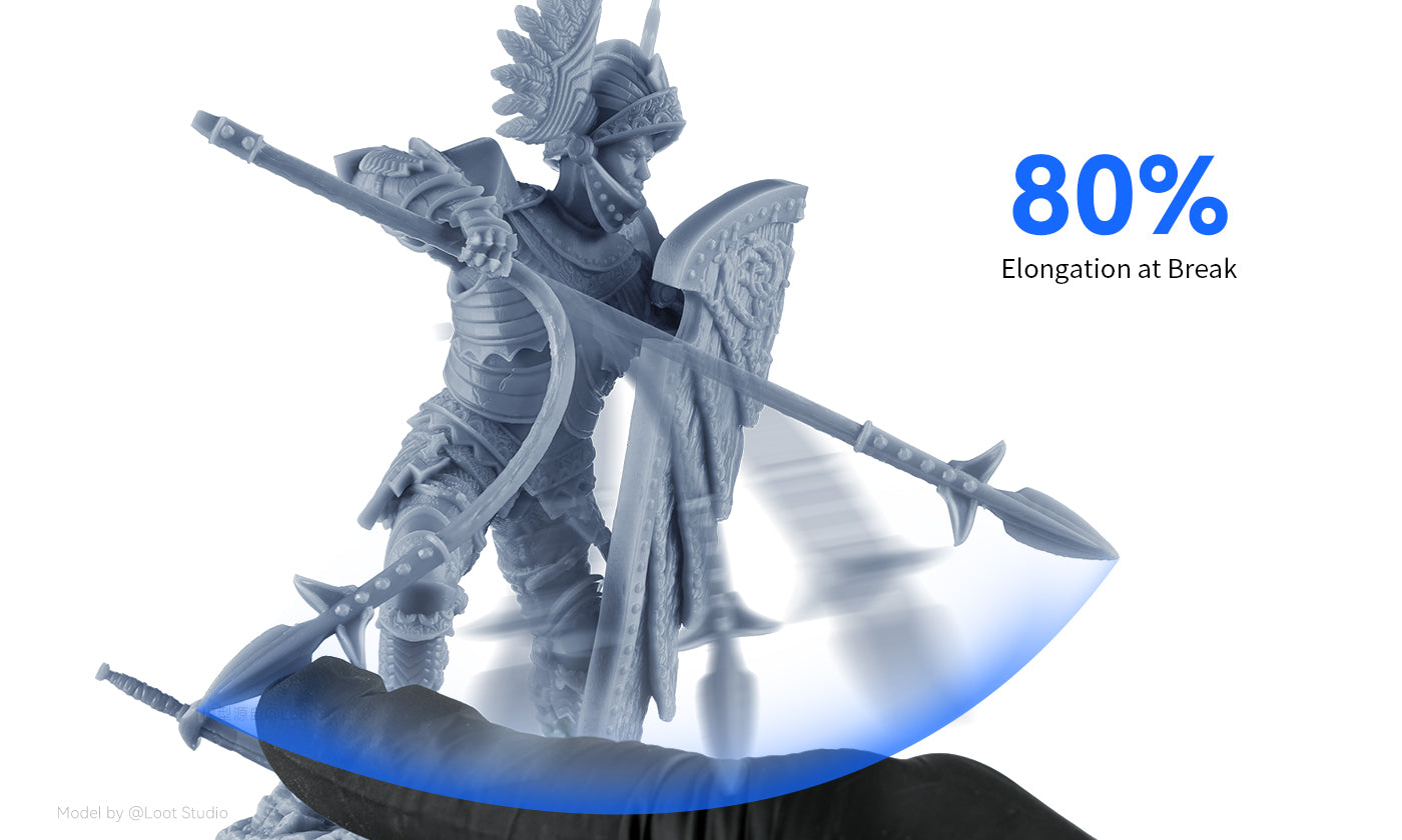With 80% elongation at break, this resin delivers exceptional toughness and flexibility. It maintains structural integrity even in thin-walled designs, resists cracking under stress, and rebounds quickly after deformation. Prints reliably withstand accidental impacts, drops, and long-distance shipping.